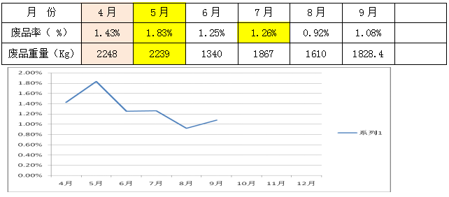2、產(chǎn)量提升。突破170噸/月,8月份達(dá)到175噸,比7月份增產(chǎn)約27噸,9月份與5月份同比增長了38.44%;